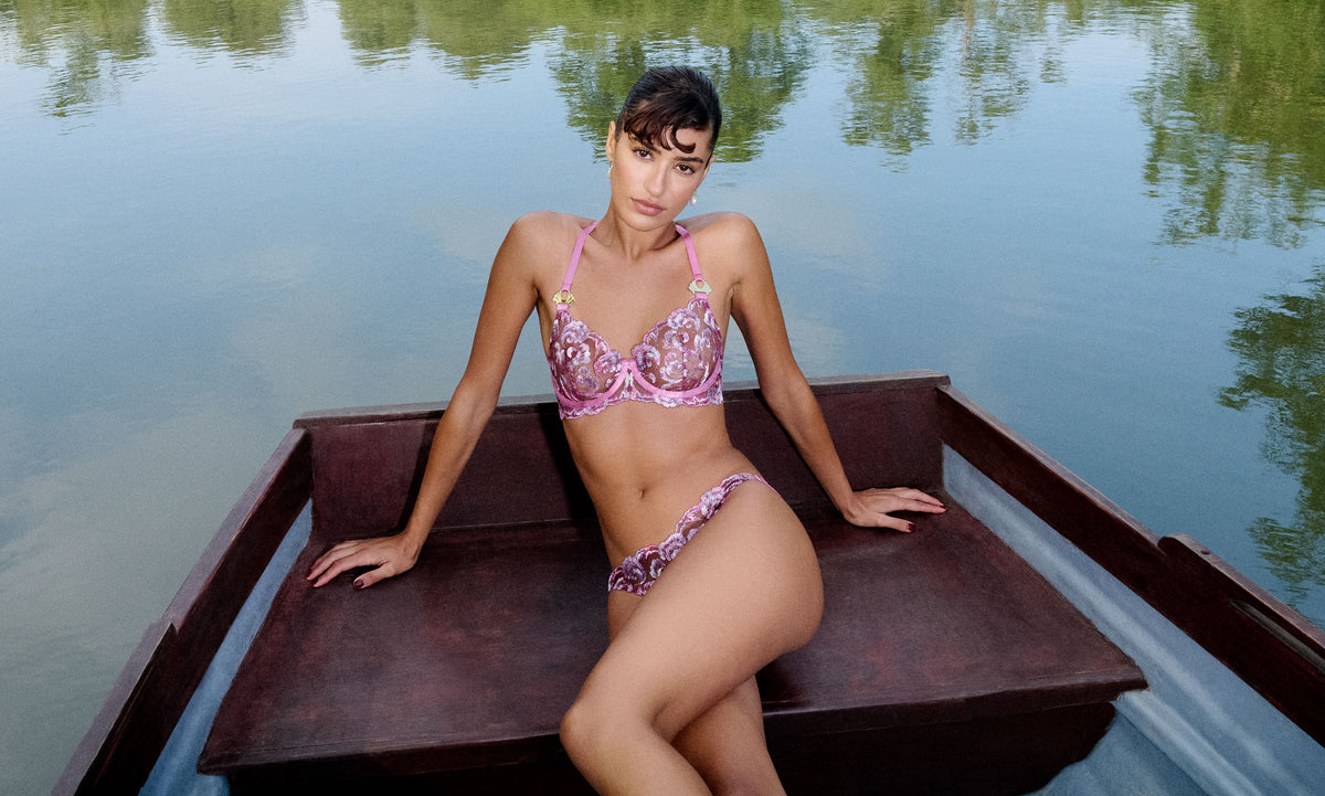 Bordelle's bestselling lingerie colourway is back this season. Reimagined in bespoke Swiss embroidery in a wave-inspired design printed with blue and silver shades printed over pearlescent white threads.